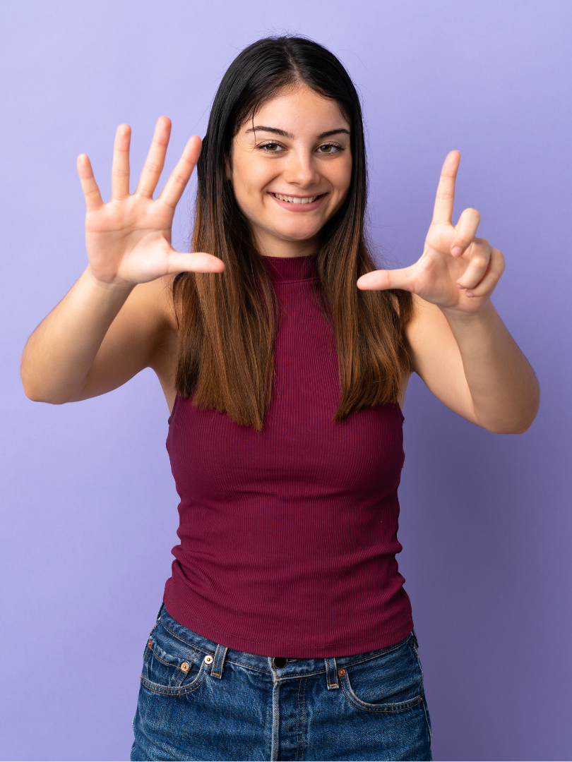 Then, I jump right into the numbers from twenty to fifty. We represent this with two hands: fingers on the left hand for the tens column and fingers on the right for the ones. (So five on the left and two on the right = 52).